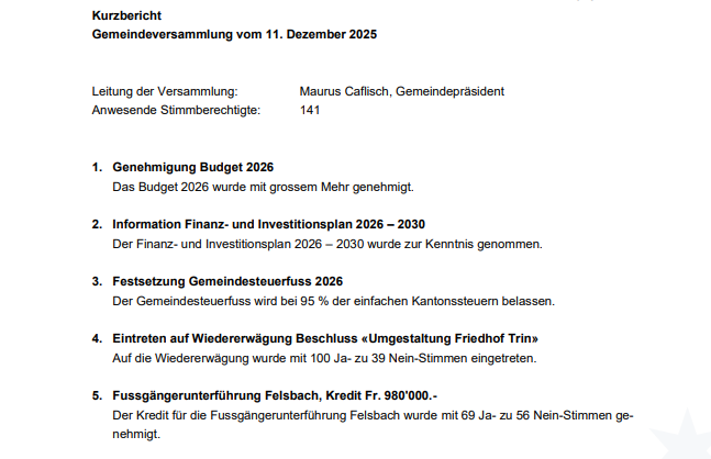 Kurzbericht Gemeindeversammlung vom 11. Dezember 2025